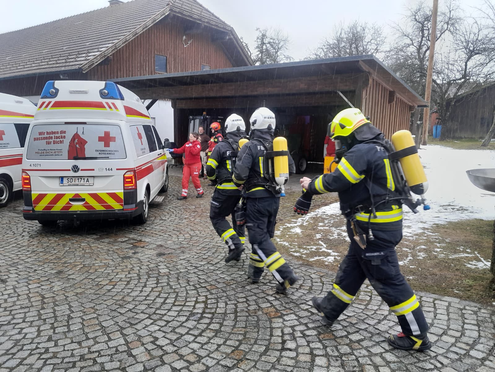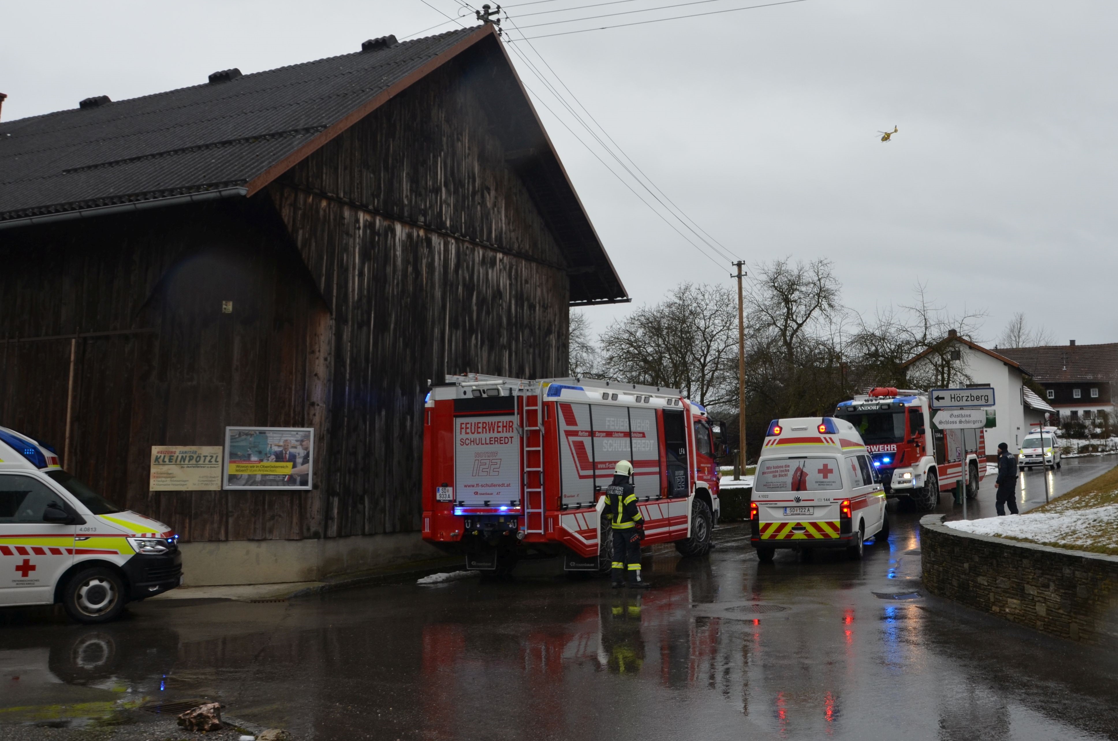 Am Samstagvormittag, den 21.02.2026, kam es in einer Werkstatt in Großschörgern aufgrund eines technischen Defekts zu einem CO-Austritt. Die drei in der Werkstatt anwesenden Personen konnten noch selbstständig den Notruf wählen und ins Freie gelangen. Das Rote Kreuz war mit einem Großaufgebot vor Ort. Eine Person wurde per Rettungswagen ins Krankenhaus gebracht, während der Werkstattinhaber mit dem Rettungshubschrauber abtransportiert werden musste. Die Feuerwehren Andorf und Schulleredt übernahmen unter Atemschutz die Kontrolle und Messung der CO-Werte in den Innenräumen. Parallel dazu wurde die Werkstatt mittels Belüftungsgeräten umfassend gelüftet.